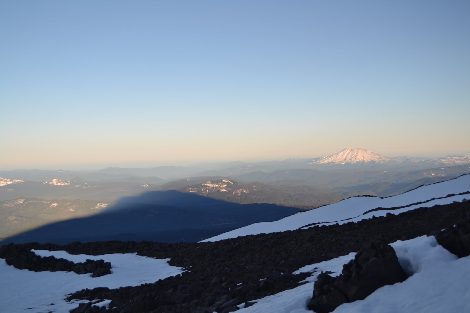 We hiked with our skis and ski boots on our back. It made the way up a lot harder having all that extra weight, but the way down would be much quicker and more enjoyable. I dropped my skis off on the side of the trail after a couple hours of hiking, Scott a little after that. After dropping the weight, the pace felt much more comfortable. It was a couple hours into the hike when there was just enough sunlight to see outline of the peak. It was a pretty sweet sight. We reached the glaciated portion of the hike, and eventually put on our crampons. Since the weather had been pretty warm, the snow even near the top was softer than I expected, but crampons and an ice axe were still needed for a safe ascent. About 1,000 feet from the summit there are several open volcanic vents. It is an interesting sight, but the extremely strong sulfer smell was somewhat nausiating. It gave me motivation to not rest too long and keep going, even with how tired I was.